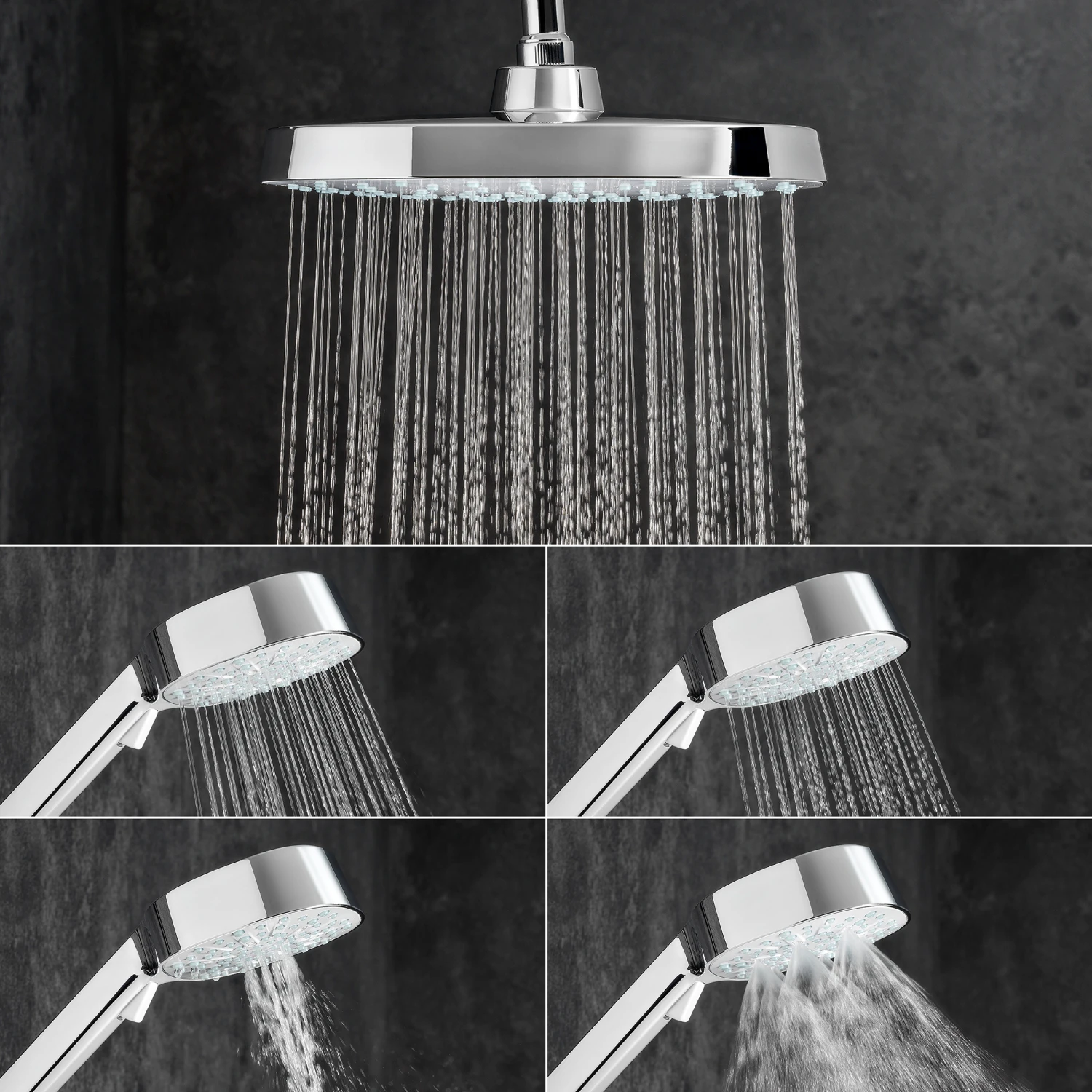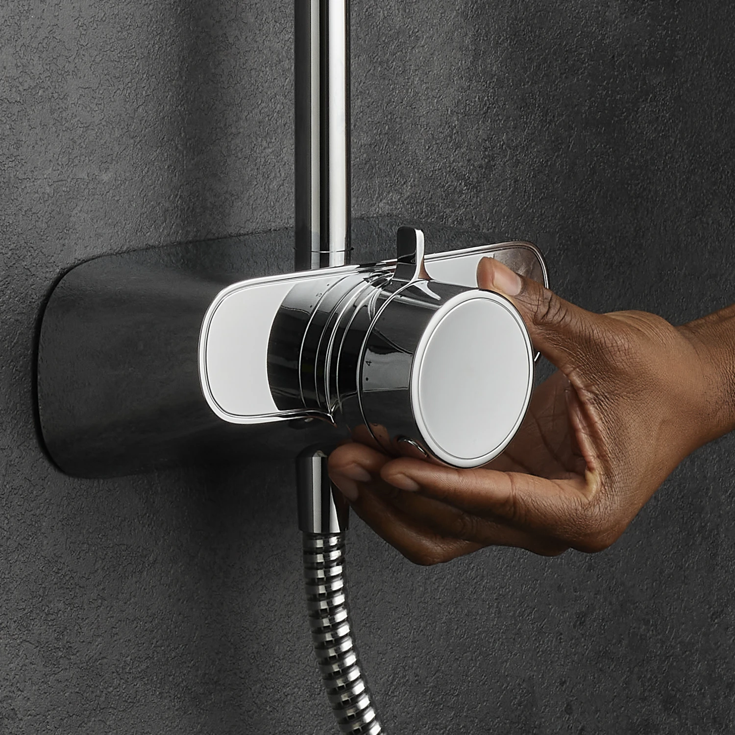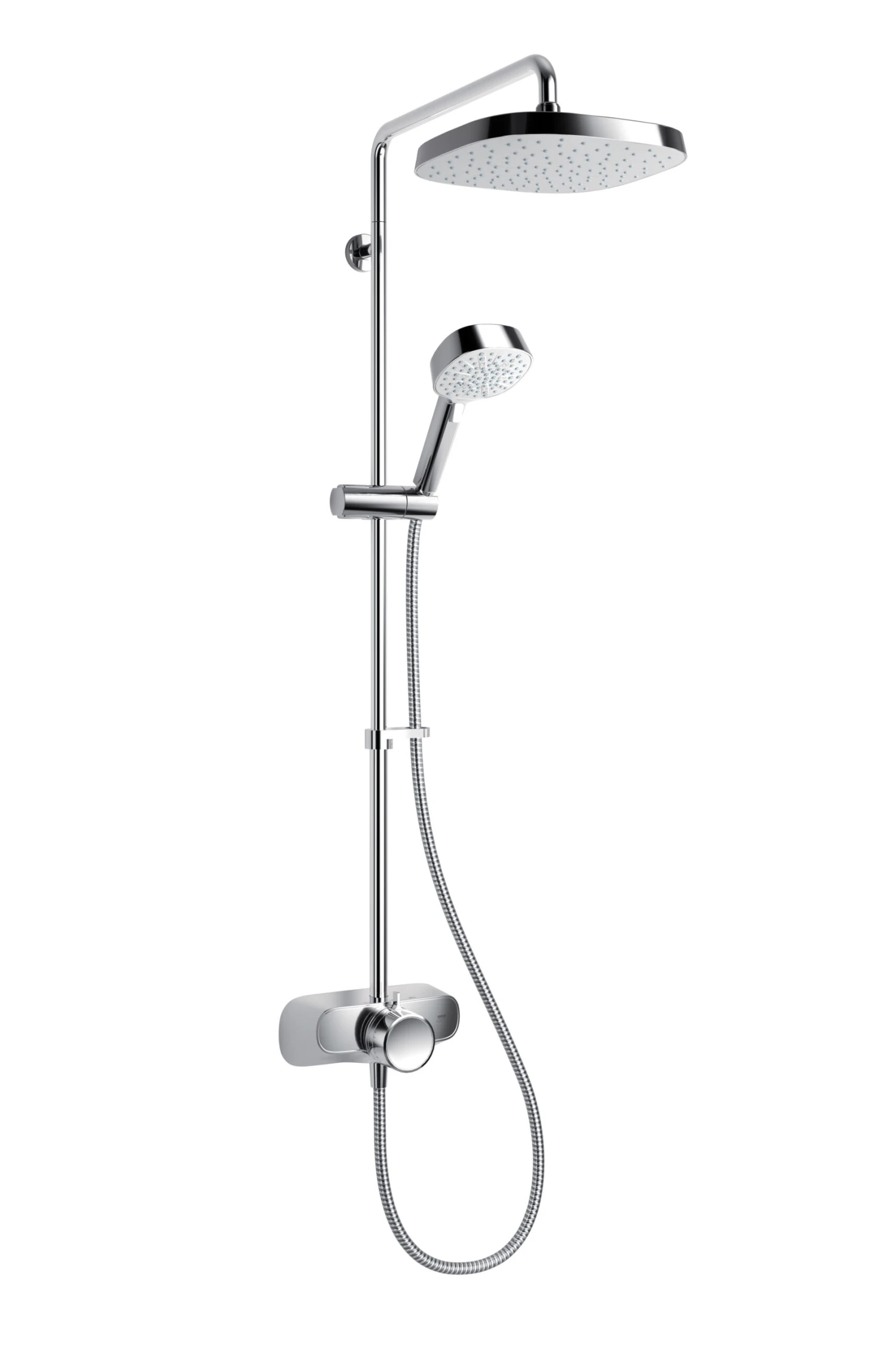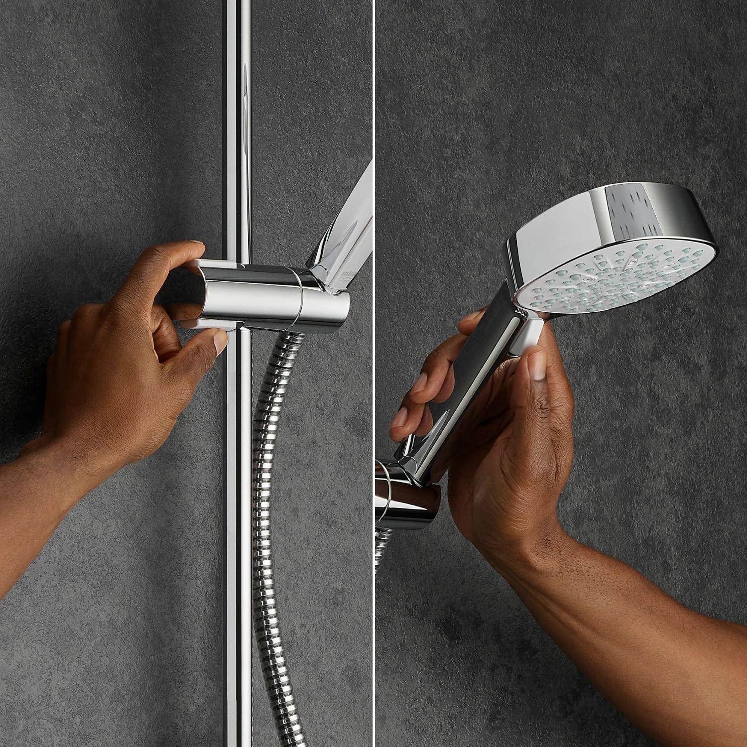 - The arm of the deluge overhead moves left and right. So even if you need to install the slider bar off-centre, the flow can still be centralised over the shower area.