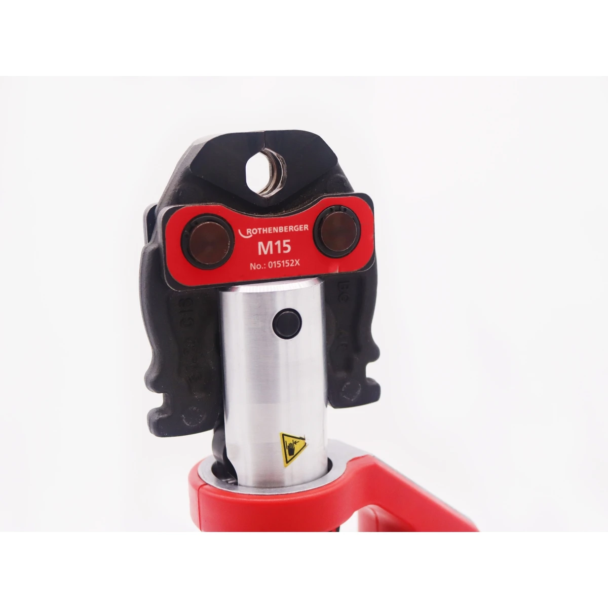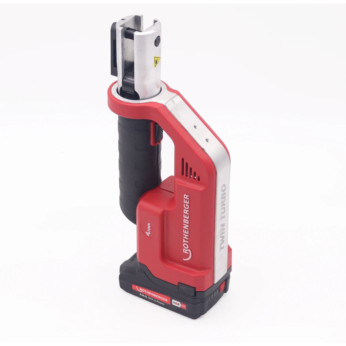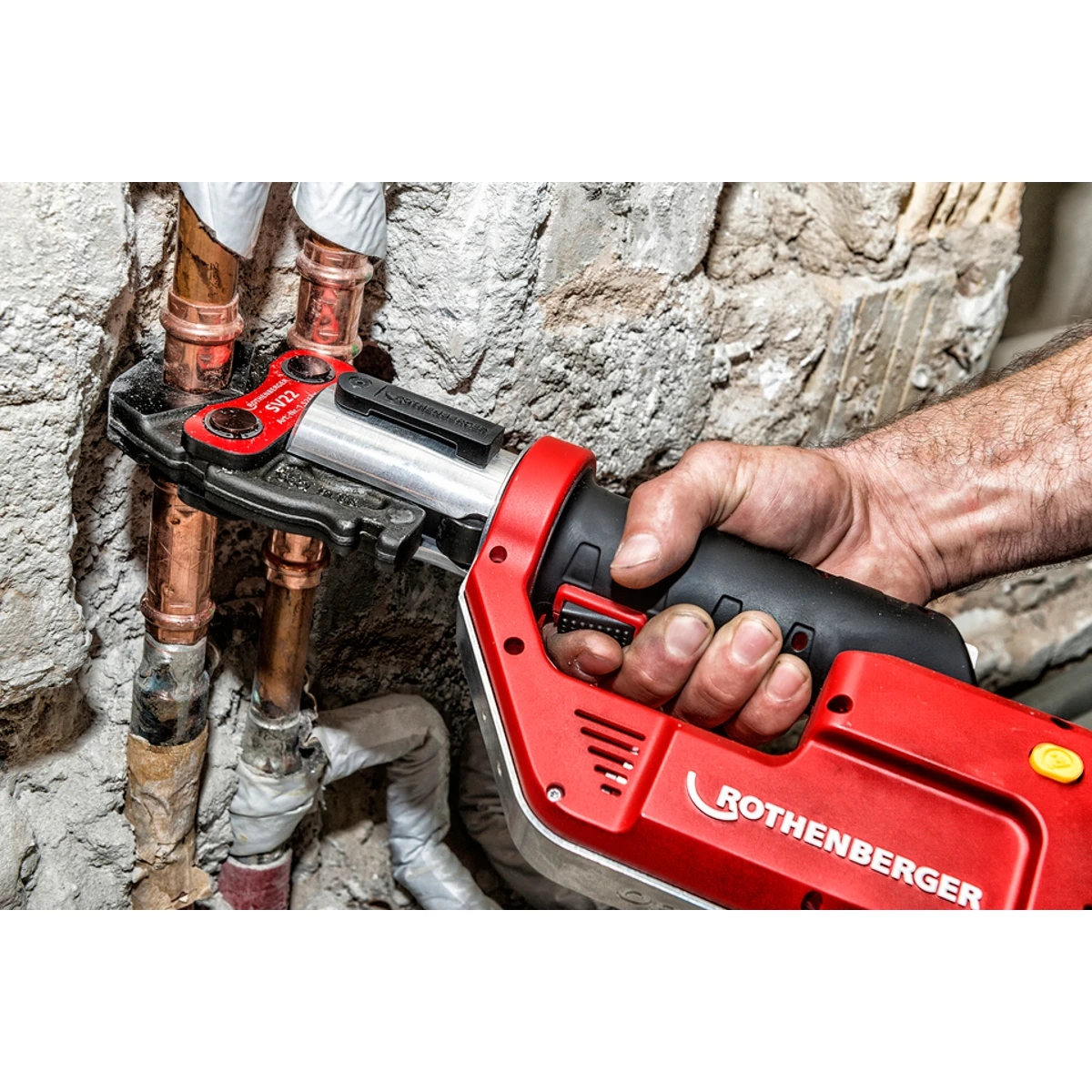Electro-hydraulic press machine for battery operated pressing of fittings up to 35mm dia. A compact and lightweight yet powerful machine.